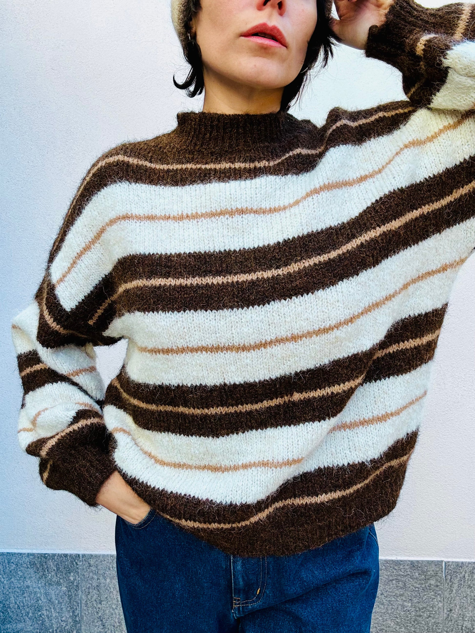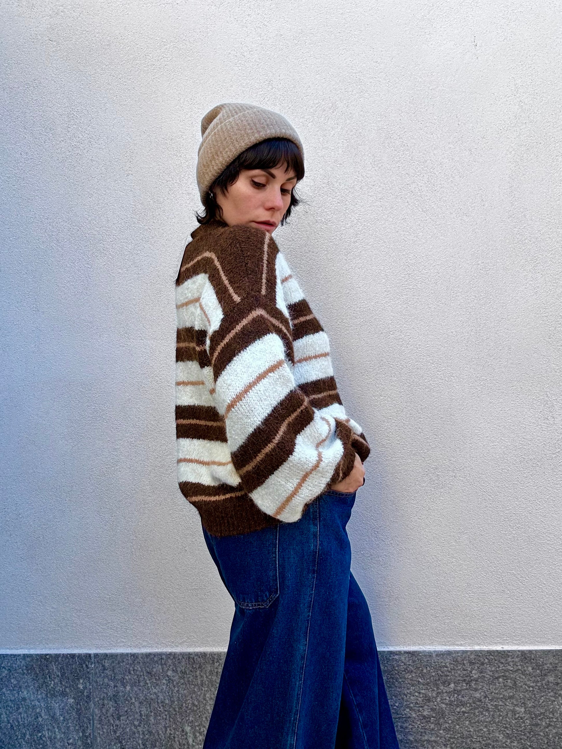Maglioncino rigato manica a sbuffo marrone